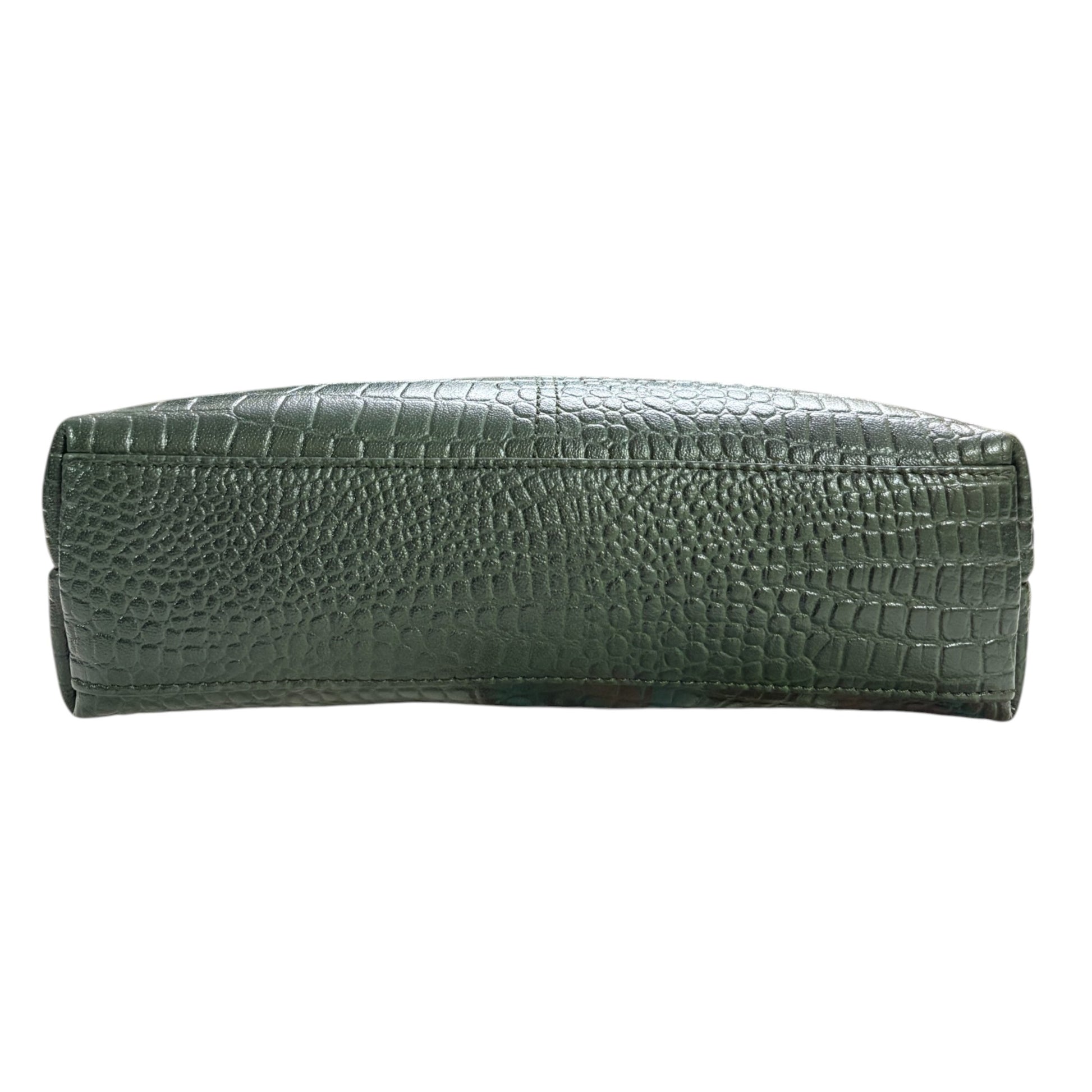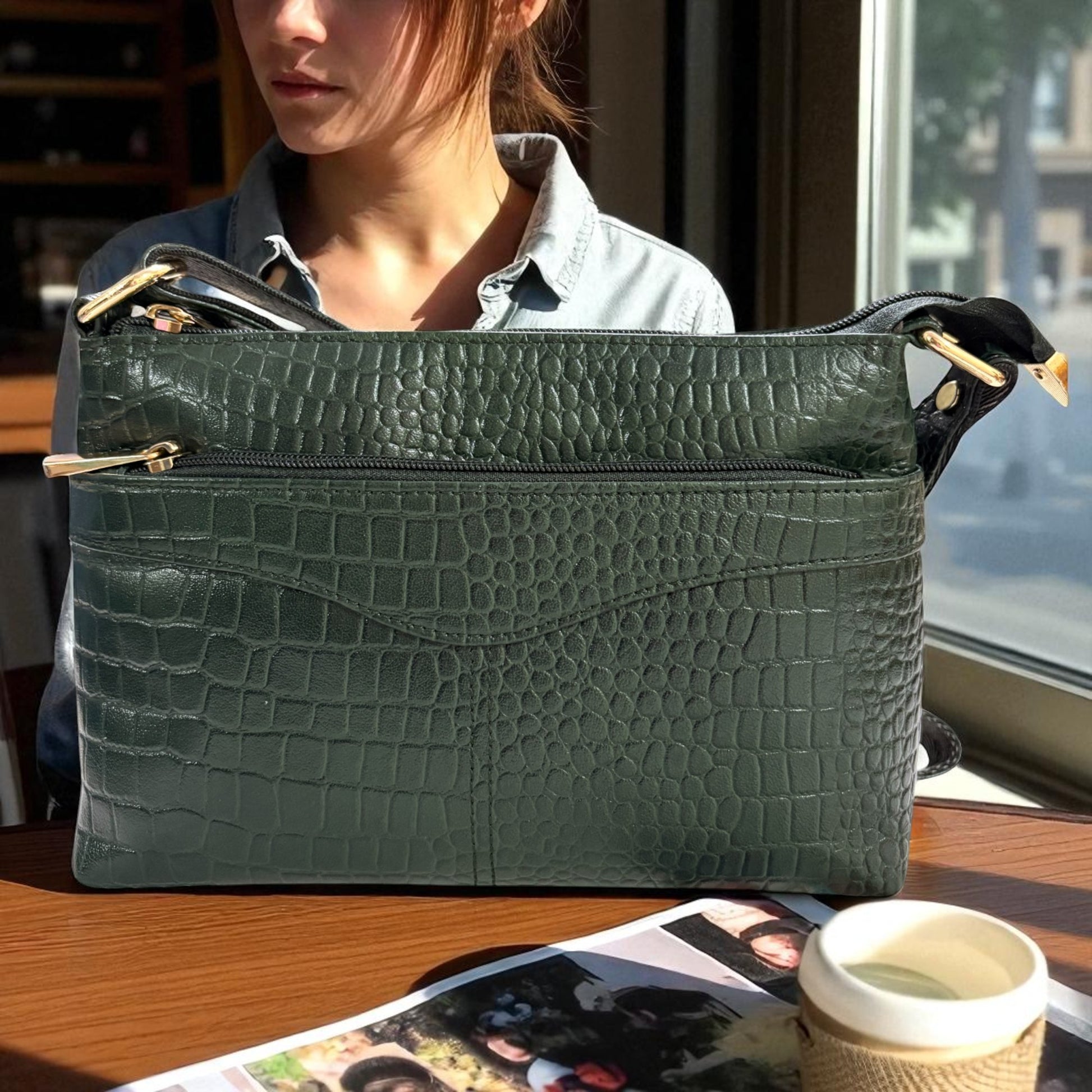 Compact Crossbody Bag, Crocodile Design, Dark Green Genuine Leather, Multi-Compartment with Gold Hardware (Dark Green)
