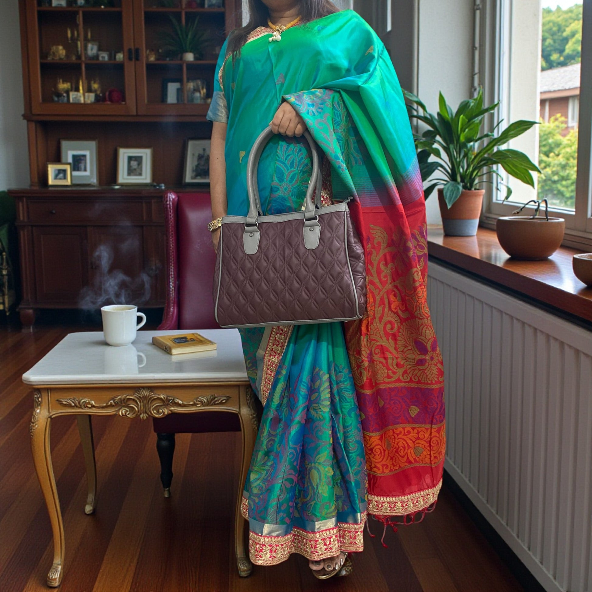Quilted Burgundy Leather Handbag for Women – Genuine Leather Bag with Grey Accents, Spacious Interior, Top Handles & Zippered Compartment | Elegant Utility Tote for Daily & Office Use