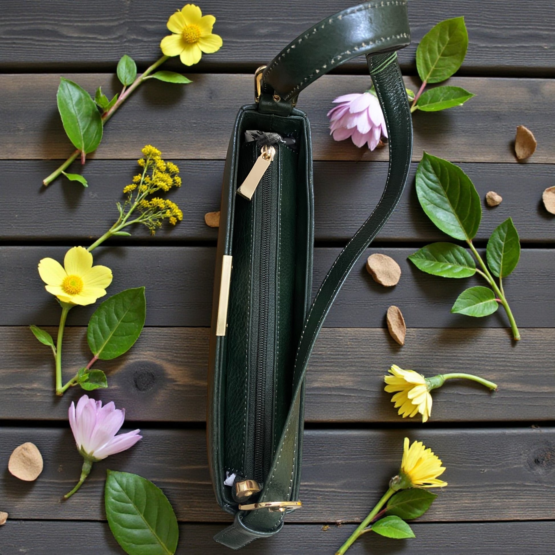 Women's Leather Shoulder Bag | Genuine Leather Baguette-Style Handbag with Gold-Tone Hardware | Slim Profile Purse with Single Strap for Daily & Formal Use | Elegant & Durable (Bottle Green)